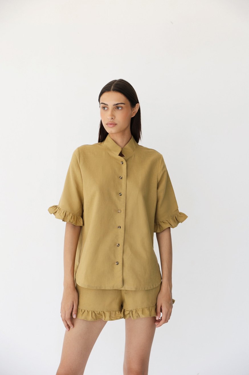 Košulja ima čistu liniju sa kopčanjem duž cele prednje strane, uz suptilne volane na rukavima koji strukturi daju ženstvenu notu. Uparena sa odgovarajućim šortsem, dizajniranim sa udobnim elastičnim pojasom i diskretnim volan detaljima, ovaj set spaja komfor i nenametljivu sofisticiranost.