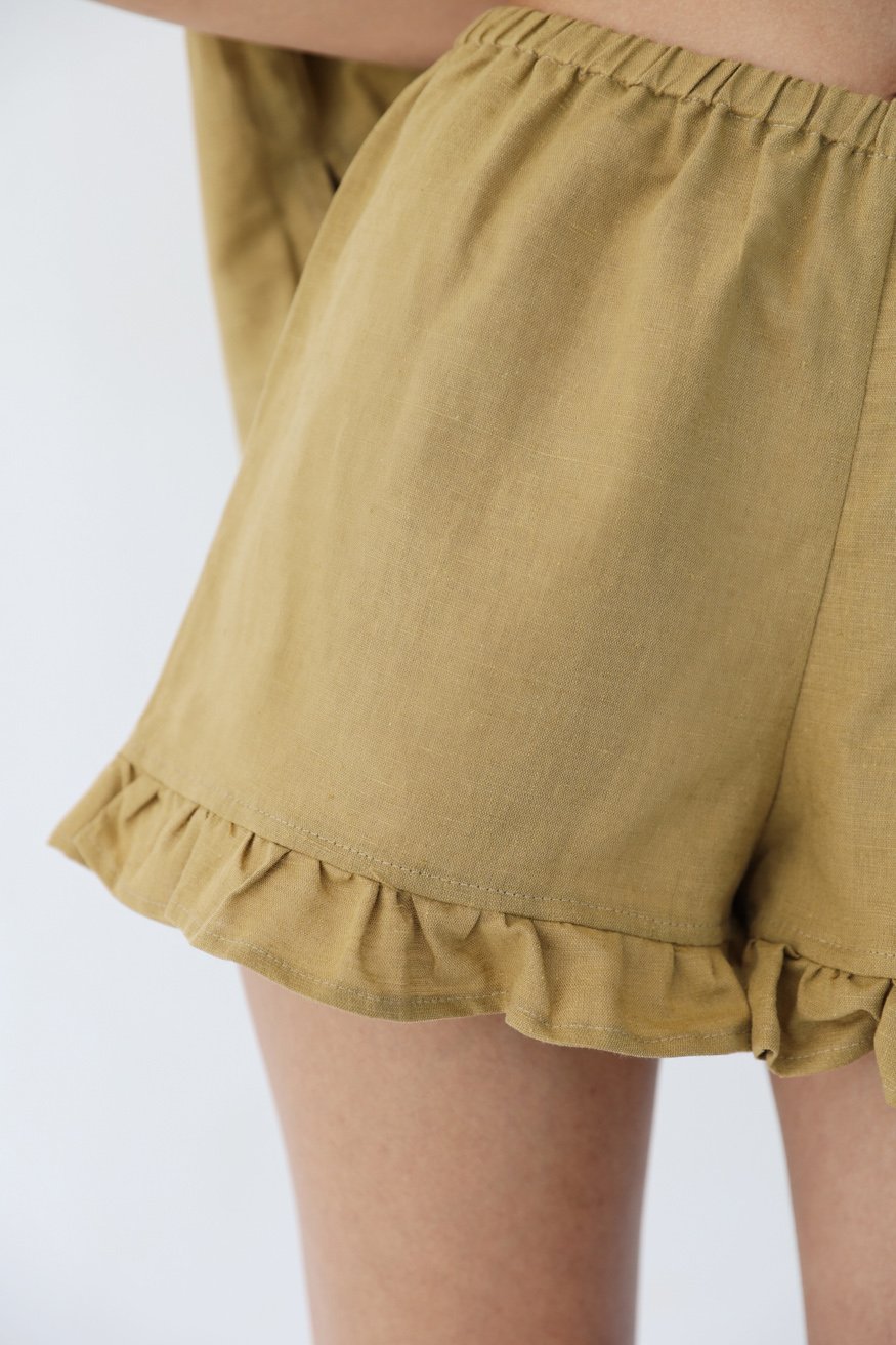 Angie set je izrađen od prozračnog, 100% lana i oličava lakoću i eleganciju letnjeg stila. Dizajniran u nežnoj senf žutoj nijansi, ovaj dvodelni set nudi opuštenu, ali profinjenu siluetu, idealnu za tople dane i prijatne letnje večeri.
