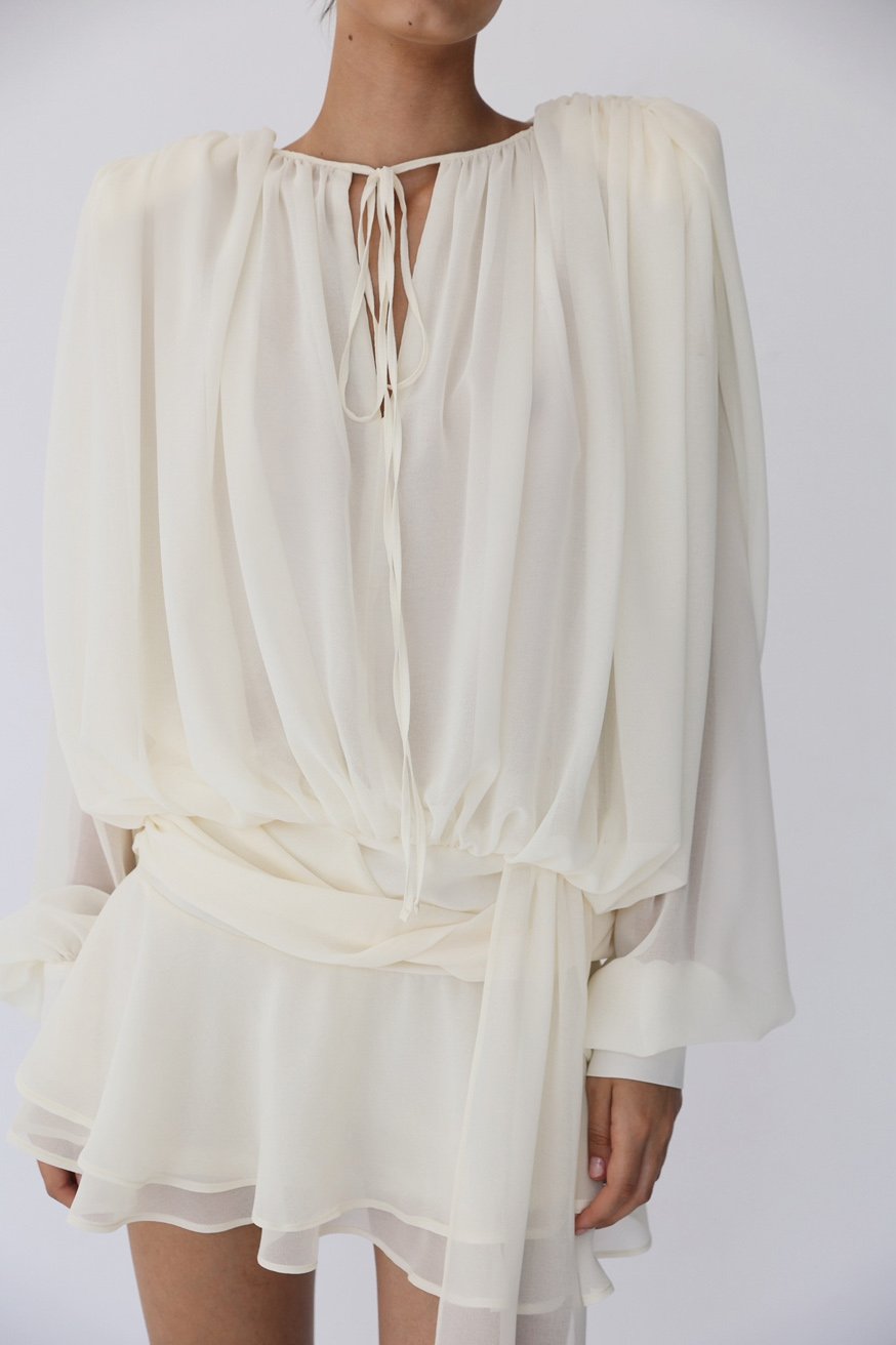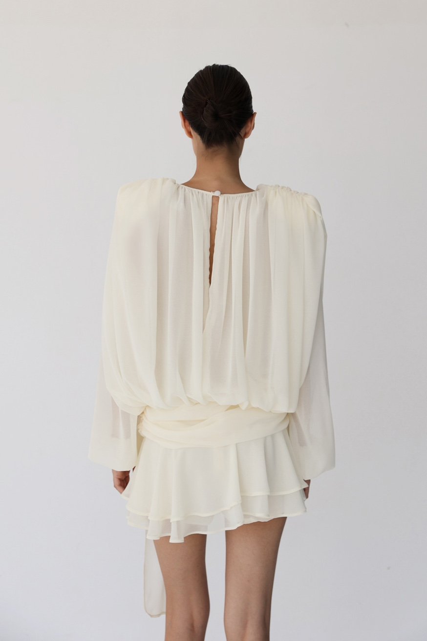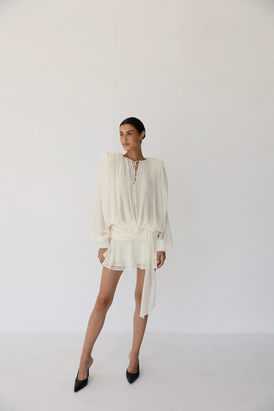 Elaria haljina je suptilan statement komad koji odiše nenametljivom ženstvenošću i profinjenom elegancijom. Izrađena od kvalitetne mešavine poliestera i viskoze, prelepo se spušta niz telo i pruža lepršav pokret pri svakom koraku. Njena lagana silueta ističe se nežno naboranim detaljima oko struka, dugim, lepršavim rukavima i slojevitim porubima koji stvaraju graciozan, eteričan tok.