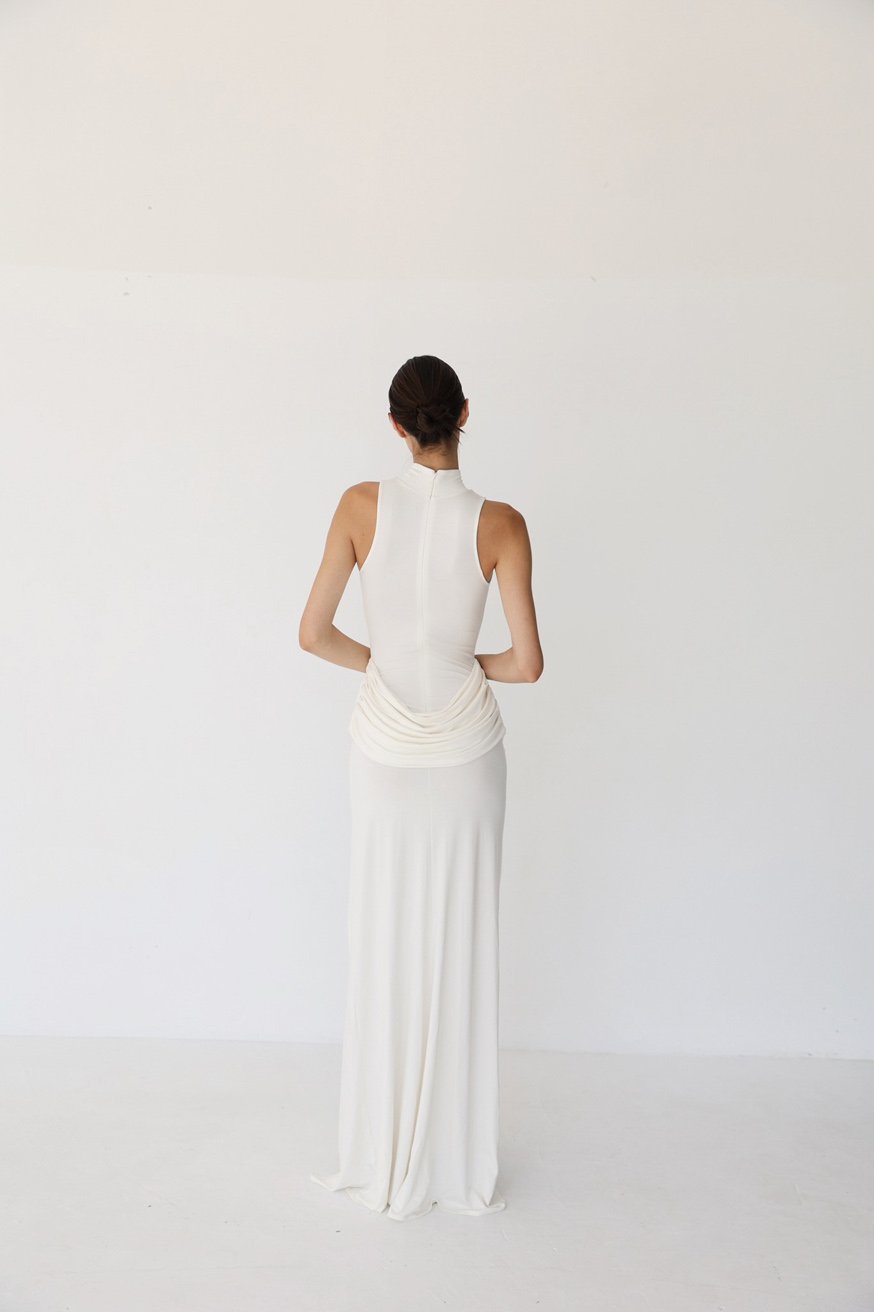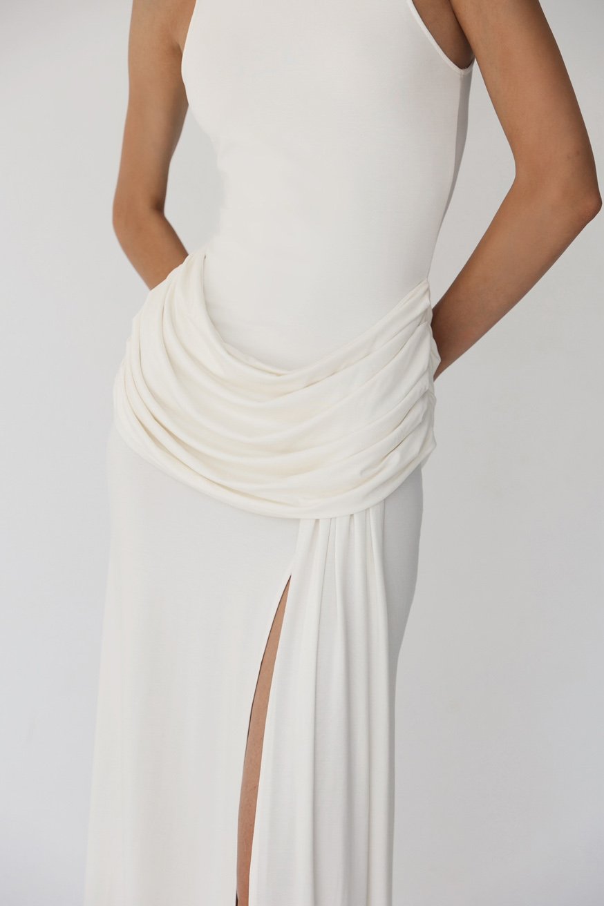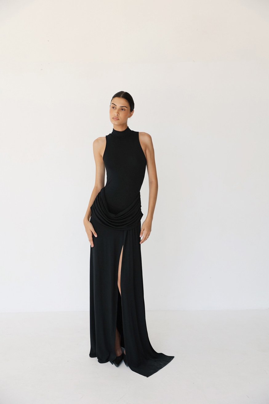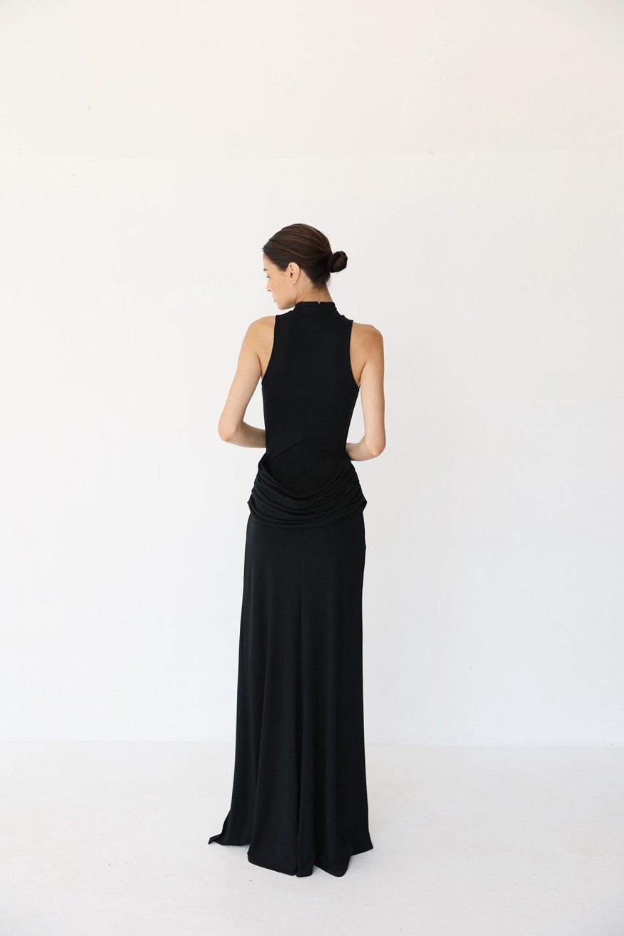 Zephyra haljina je oličenje bezvremenske elegancije i moderne senzualnosti. Izrađena od luksuzne 100% viskoze, pruža gladak, mekan pad koji se prelepo kreće sa svakim pokretom, naglašavajući prirodnu siluetu tela. Sa visokim izrezom i pripijenim, bezrukavnim gornjim delom, haljina spaja sofisticiranost sa smelom notom. Drapirani detalji u predelu struka dodaju dubinu i stvaraju laskav, suženi efekat, dok visoki prednji prorez unosi zavodljivu ženstvenost i slobodu pokreta.